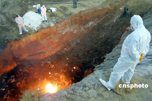 |   十一月十六日,新疆烏魯木齊縣安寧渠鎮(zhèn)的防疫人員在深約五米的掩埋坑內(nèi)集中焚燒收集來的家禽。目前,新疆兩地疫區(qū)已在三公里范圍內(nèi)撲殺家禽三十二點二五萬只。據(jù)中國農(nóng)業(yè)部公布,新疆澤普縣、烏魯木齊縣兩地發(fā)生高致病性疫情。疫情發(fā)生后,當(dāng)?shù)卣皶r啟動有關(guān)應(yīng)急預(yù)案,在疫區(qū)各交通路口設(shè)立臨時動物簡易消毒站,禁止疫區(qū)禽類產(chǎn)品運出,并撲殺疫區(qū)內(nèi)所用禽類,進(jìn)行無害化處理,關(guān)閉疫區(qū)周圍十公里范圍內(nèi)的所有禽類及其產(chǎn)品交易市場。作者:姚剛(通訊員)  |  |  |