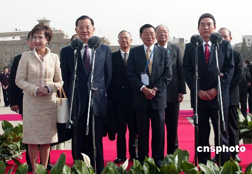 |   4月13日下午,中國(guó)國(guó)民黨榮譽(yù)主席連戰(zhàn)率一百七十余人抵達(dá)北京,參加將于十四日在這里舉行的國(guó)共兩岸經(jīng)貿(mào)論壇。圖為連戰(zhàn)抵京后在首都機(jī)場(chǎng)發(fā)表演講。作者:盛佳鵬  |  |  |