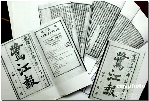 |   在福州著名譜牒研究學(xué)者林偉功家里,林偉功向記者展示他發(fā)現(xiàn)的連戰(zhàn)祖父連橫104年前主撰的12篇福州新聞。這12篇新聞分別刊載在光緒二十八年(1902年)十一月初一和十一日的《鷺江報(bào)》上。連戰(zhàn)祖父連橫先生那時(shí)是這家報(bào)社的主筆,負(fù)責(zé)新聞的采寫(xiě)。這兩份報(bào)紙上還蓋有福州鄉(xiāng)賢、新中國(guó)成立后第一任國(guó)家文物局局長(zhǎng)鄭振鐸的收藏印章。圖為12篇新聞刊在104年前的《鷺江報(bào)》上。作者:楊勇 |  |  |