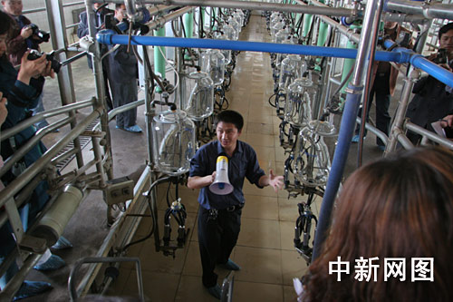 在杜爾伯特泰康奶牛飼養(yǎng)示范廣場,網(wǎng)絡(luò)媒體記者了解現(xiàn)代化的榨乳設(shè)備和流程。