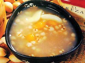 【制作】將糯米搗碎,薏米仁洗凈,紅棗去核后一同入鍋內(nèi),加清水適量煮粥,待粥煮至濃稠時(shí),放入適量紅糖再煮片刻。
