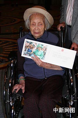 107歲的“人頭稅”苦主遺孀吳三英坐著輪椅來到溫哥華分會場,見證百年恥辱一朝雪的歷史時刻。中新社記者呂振亞攝