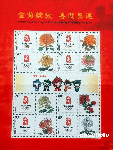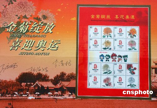 |   10月18日,隨著中國開封第24屆菊花花會的開幕,《金菊綻放迎奧運》個性化郵票發(fā)行儀式在河南省開封市午朝門廣場舉行!督鹁站`放迎奧運》個性化郵票是以第29屆奧運會會徽為主圖的個性化郵票,該套個性化郵票有三大特點:一是奧運會徽和吉祥物“福娃” 首次出現(xiàn)在同一版面上,二是首次以城市市花與奧運會徽相結合,三是迄今為止個性化郵票中使用主圖最多的一套。更主要的是奧運會徽的主要設計者之一張武先生是開封人,該套個性化郵票的發(fā)行表達了他心系奧運、情系家鄉(xiāng)的意愿。中新社發(fā) 凱楓 攝