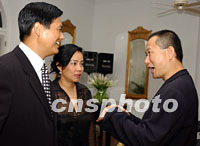 ![]() 澳門政府4日邀請(qǐng)香港巨星周潤(rùn)發(fā)出席"第十五屆澳門國(guó)際音樂節(jié)"中的臥虎藏龍音樂會(huì),澳門文化局局長(zhǎng)何麗鉆向發(fā)仔贈(zèng)送紀(jì)念品。中新社圖 任晨鳴 攝 ![]() 專程到澳門出席 "第十五屆澳門國(guó)際音樂節(jié)"臥虎藏龍音樂會(huì)的香港巨星周潤(rùn)發(fā)和夫人,4日與奧斯卡金像獎(jiǎng)得主、著名指揮家譚盾在澳門喜相逢。中新社圖 任晨鳴 攝