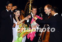 組圖:周潤(rùn)發(fā)出席澳門(mén)國(guó)際音樂(lè)節(jié) 2001年10月05日 18:57 ![]() 由奧斯卡金像獎(jiǎng)獲得者譚盾(右一)指揮、由多名國(guó)際音樂(lè)家和上海交響樂(lè)團(tuán)演出的"臥虎藏龍"音樂(lè)會(huì),4日晚在"第十五屆澳門(mén)國(guó)際音樂(lè)節(jié)"演出成功后,周潤(rùn)發(fā)向音樂(lè)家表示祝賀。中新社圖 任晨鳴 攝 ![]() 香港巨星周潤(rùn)發(fā)4日到澳門(mén)出席"第十五屆澳門(mén)國(guó)際音樂(lè)節(jié)"中的"臥虎藏龍"音樂(lè)會(huì)后,澳門(mén)特區(qū)政府社會(huì)文化司司長(zhǎng)崔世安向周潤(rùn)發(fā)頒發(fā)紀(jì)念品。中新社圖 任晨鳴 攝