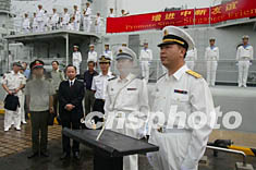 ![]() 中國海軍首次環(huán)球航行訪問艦艇編隊(duì)指揮員丁一平少將,二十三日上午在新加坡海軍基地樟宜港致答辭,感謝新加坡各界的熱烈歡迎。中新社圖 躍勝岐 攝