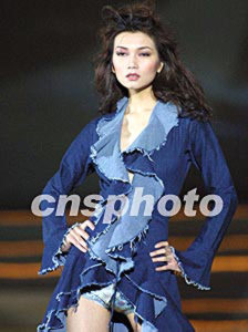 在2002年中國廣州(新塘)國際牛仔服裝節(jié)上,香港設計師俞儷軒的作品四日晚由中國名模姜培琳領銜展現(xiàn)在人們面前。作者:趙振清