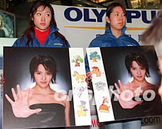 香港歌星梁詠琪今年在北京成為奧林巴斯商家代言人。二十九日,兩位北京小姐在翠微商廈手捧梁詠琪的兩幅細(xì)微差異肖像請(qǐng)顧客辨認(rèn),優(yōu)勝者可以獲獎(jiǎng)。作者:鄒憲