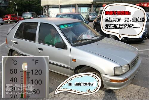最后我們的神秘車型終于要登場了,剛鉆進車子就感覺到一股熱浪,再看溫度計,已經(jīng)死死地定格在50度,估計溫度想往上飆也只恨刻度太少不能表現(xiàn)了,打開空調(diào)的冷風,怎么感覺都是熱風吹來?