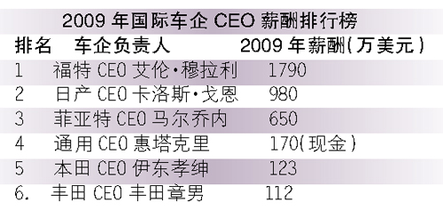 2009年,福特CEO艾倫·穆拉利的綜合薪酬(包括薪水、股票及獎金在內(nèi))在2008年的基礎(chǔ)上增加了6%,共計1790萬美元,在所有車企CEO中一枝獨秀,當然,福特也是“物有所值”的。正是在穆拉利的不懈努力下,出售沃爾沃等品牌,集中精力做一個“福特品牌”,公司最終在2009年扭虧為盈,避免了像通用和克萊斯勒那樣遭受破產(chǎn)保護的厄運,這些努力為穆拉利帶來了綜合薪酬的增加。