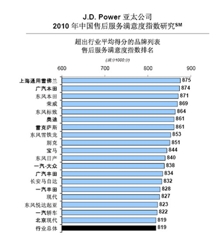 2010年中國(guó)售后服務(wù)滿意度指數(shù)調(diào)研主要是衡量車主在購(gòu)車的12至24個(gè)月期間,對(duì)中國(guó)市場(chǎng)授權(quán)經(jīng)銷商提供的保養(yǎng)和維修服務(wù)的滿意度。報(bào)告評(píng)測(cè)了五個(gè)要素:服務(wù)質(zhì)量、服務(wù)后交車、服務(wù)啟動(dòng)、服務(wù)顧問(wèn)以及服務(wù)設(shè)施。設(shè)置總分為1000分,前三名分別獲得875、874、871的評(píng)分。