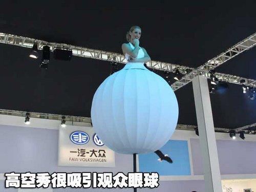 一個(gè)高高的桿子上面裝了一個(gè)雪白的球,球里面竟然冒出一個(gè)金發(fā)碧眼的美女!在大眾的展臺前,三位外國模特吸引了無數(shù)觀眾圍觀。 只見洋美女穿著雪白的裙子,爬上了一根高達(dá)3米的桿子,然后從腳下生出一個(gè)“雪球”,“雪球”把人的下半身都包裹在內(nèi),只露出上半身。三個(gè)高桿,三位美女,在空中擺出各種舞蹈姿勢,瞬間秒殺了無數(shù)相機(jī)。