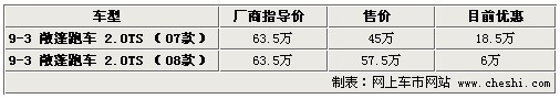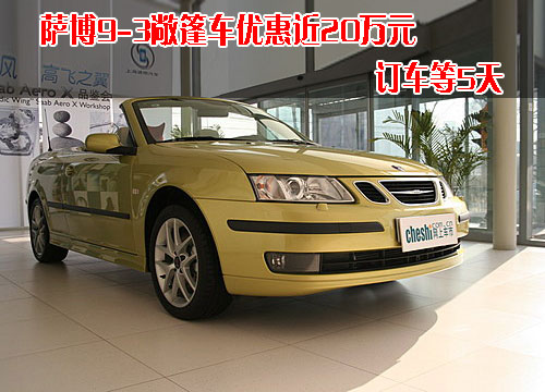 據(jù)4S店銷售人員介紹:目前薩博9-3敞蓬轎車08款車型最高優(yōu)惠6萬元,07款車型更是達到18.5萬元。無論是小編還是經(jīng)銷商處,都建議購買07款車型。08款與07款車型最大區(qū)別在于前臉部設(shè)計,在機械方面及舒適方面均無差別。目前店內(nèi)無現(xiàn)車,但是預訂07款車型僅需等待5天時間,預訂08款車型需等待2周時間。作為一款整車進口車型,訂車時間還是非常短的。