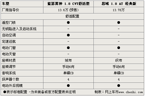在舒適配置上,藍(lán)瑟翼神與思域都配置了遙控門鎖、單碟CD、電動門窗、電調(diào)后視鏡等配置,而在此基礎(chǔ)上藍(lán)瑟翼神還配置自動空調(diào),而思域?yàn)槭謩涌刂瓶照{(diào),駕駛席座椅兩車都為絨布6向調(diào)節(jié)設(shè)置。