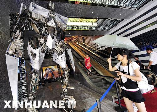 6月23日,觀眾在杭州一家電影院觀看“汽車人”。這個“汽車人”高逾4米,重達(dá)2噸,由各種廢棄汽車零件焊接組裝而成,是為即將上映的電影《變形金剛2》造勢特別制作的。新華社發(fā)(李忠 攝)