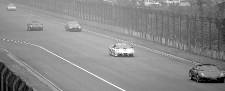 昨日上午11時許,記者在賽車場約1公里外,就聽見引擎巨大的轟鳴聲。走近后,只見一輛寶藍色法拉利跑車從賽道直行路段呼嘯而過,一輛紅色豪車接踵而至,緊接著是一輛黃色豪車。直道加速,彎道變速。飛馳的豪車引起觀眾陣陣驚呼。賽道內側空地,10余輛顏色款式各異的豪車整齊停放。車隊后方不遠處,停著一輛急救車。賽車場一名工作人員說,上午9時許,就陸續(xù)有豪車來到賽車場。