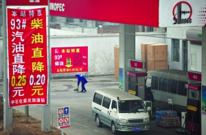 京城成品油價格戰(zhàn)再度升級。昨日記者從市場上了解到,位于京開高速大興黃村方向出口輔路邊的中石化加油站打出了“直降0.25元”的標(biāo)語,路對面的中石油加油站93#汽油降價幅度達(dá)0.3元每升,不遠(yuǎn)處的中化道達(dá)爾加油站93#汽油降幅為0.4元每升。記者了解到,以汽油來看,目前全國平均批發(fā)價和最高零售價之間的差價即利潤空間為1300-1400元/噸,相當(dāng)于每銷售1升油賺1元錢。本報記者 韓萌 攝