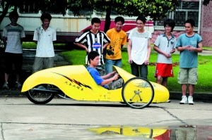日前,廣西工學(xué)院汽車工程系4名學(xué)生設(shè)計(jì)制成一輛新型環(huán)保車,每百公里耗油僅1.2升。該車最快時(shí)速能達(dá)到65公里。這輛環(huán)保車除了發(fā)動(dòng)機(jī)外,全為手工制作,車身用玻璃鋼材料制成,零件是學(xué)生自己動(dòng)手焊接而成。該車前輪為兩個(gè)自行車輪胎,后輪為摩托車輪胎。整車重量為37.5公斤,造價(jià)不足5000元。