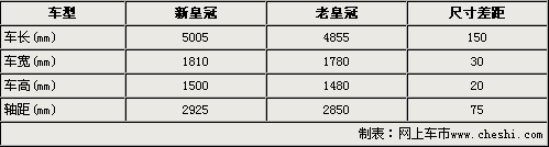 通過(guò)上表我們可以清楚的看出,豐田新皇冠車(chē)型尺寸與老款車(chē)型相比,長(zhǎng)、寬、高分別增加了150mm、30mm和20mm。同時(shí)軸距也較老款車(chē)型加長(zhǎng)了75mm。車(chē)身加大和軸距加長(zhǎng)后得到的是更舒適的后排乘坐空間,車(chē)身變長(zhǎng)對(duì)操控感會(huì)有一定的影響。
