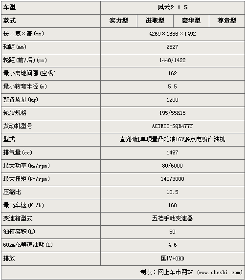 從車身尺寸來看,風(fēng)云2三廂要比新旗云小很多,但在軸距方面卻比新旗云大不少,可以預(yù)計車內(nèi)空間相當(dāng)?shù)貌诲e。在動力上,風(fēng)云2裝備的是奇瑞自主研發(fā)的SQR477F發(fā)動機(jī),最大功率80kw,最大扭矩140牛米,配合5速手動變速器,并且在排放上達(dá)到了國Ⅳ標(biāo)準(zhǔn)。
