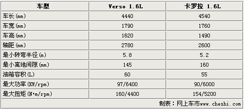 豐田Verso與卡羅拉雖然采用了同一技術(shù)平臺(tái),但是由于這兩款車(chē)的類(lèi)型不同,因此在車(chē)身尺寸方面也存在著較大的差異。豐田Verso雖然在車(chē)長(zhǎng)方面遜于卡羅拉,但是在車(chē)寬、車(chē)高及軸距方面,這款MPV車(chē)型還是占據(jù)著明顯的優(yōu)勢(shì)。另外,這兩款車(chē)雖然均采用1.6L發(fā)動(dòng)機(jī),但是由于調(diào)校的不同,豐田Verso在動(dòng)力上要優(yōu)于卡羅拉。