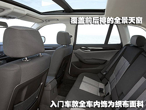 已經(jīng)出現(xiàn)在現(xiàn)款X3身上的全景大天窗同樣也會(huì)出現(xiàn)在BMW X1配置中,在同級(jí)別車型中并不多見(jiàn)的差尺寸天窗一定會(huì)受到不少潛在車主的喜愛(ài)。