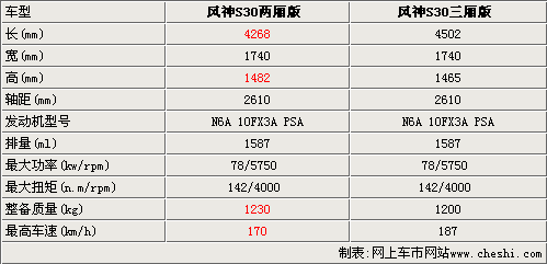 風(fēng)神S30兩廂版在尾部的車身結(jié)構(gòu)上有明顯變化,所以整車的參數(shù)也會(huì)隨之改變。通過與三廂車型的參數(shù)對比發(fā)現(xiàn),風(fēng)神S30兩廂版的車身尺寸有了明顯變化,其中長度縮短了234毫米,高度則增加了17毫米。雖然外形尺寸有明顯變化,但風(fēng)神S30兩廂版的軸距并無改變,保障了后排的空間優(yōu)勢。風(fēng)神S30兩廂版依然采用PSA 1.6L發(fā)動(dòng)機(jī),但整備質(zhì)量增加了30公斤,多少會(huì)影響整車的動(dòng)力性能,最高車速只能達(dá)到170公里每小時(shí)。