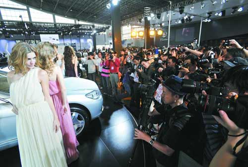 網(wǎng)友“午夜鐘聲”正在奔馳展位上尋找著最合適的拍攝位置,“去年奔馳展位上的洋車模最為出彩,今天肯定要來(lái)看一看!彼9點(diǎn)就來(lái)到車展主會(huì)場(chǎng),帶著全套攝影裝備,一個(gè)小時(shí)收獲了300多張照片,“回去整理好就貼我的博客上去!彼d沖沖地說(shuō)。