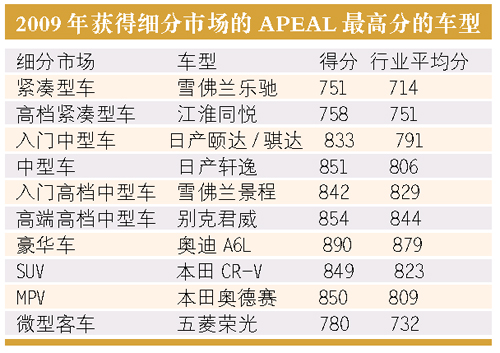 從J.D. Power的研究數(shù)據(jù)中可以看到,車(chē)主對(duì)新車(chē)性能和設(shè)計(jì)的總體滿(mǎn)意度進(jìn)步不明顯:2009年,APEAL平均得分為799分(總分為1000 分),而2007年和2008年的分?jǐn)?shù)分別為797分和800分,三年來(lái)幾乎沒(méi)有變化。
