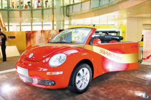 12月9日,繼兩輛水晶版新甲殼蟲敞篷車在天津、上海閃耀登場后,第三輛由水晶裝飾而成的新甲殼蟲敞篷車亮相深圳萬象城,紅色的水晶版新甲殼蟲敞篷車,在巨型水晶圣誕樹的映襯下顯得格外鮮艷奪目。晶瑩剔透的水晶在燈光的照耀下折射出迷人的光芒,令新甲殼蟲敞篷車宛如童話世界中的夢幻之車,不時有消費(fèi)者拿出相機(jī)與閃耀的新甲殼蟲敞篷車合影。新甲殼蟲敞篷車的車標(biāo)、方向盤、手剎柄、變速箱手柄等地方都鑲嵌著施華洛世奇水晶,紅色的新甲殼蟲敞篷車身和晶瑩剔透的水晶裝飾烘托出濃濃的節(jié)日氣氛,為消費(fèi)者奉獻(xiàn)了2009年圣誕與2010年新年期間最亮麗、最浪漫的節(jié)日驚喜。而香港巨星劉嘉玲在現(xiàn)場與水晶版新甲殼蟲敞篷車“相互輝映”,并和現(xiàn)場的觀眾親密互動,更將現(xiàn)場氣氛推向了高潮。