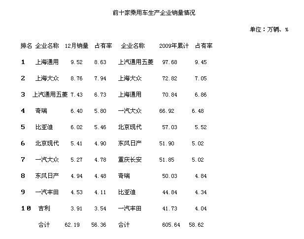 數(shù)據(jù)顯示,受益于上汽通用五菱、上海大眾、上海通用的聯(lián)合發(fā)力,上汽去年銷量同比增長(zhǎng)了57.23%,其中,生產(chǎn)微型車的上汽通用五菱貢獻(xiàn)了97.68萬輛的銷量,同比增長(zhǎng)66.68%,為上汽鞏固霸主立下了巨大戰(zhàn)功。同樣受惠于購(gòu)置稅減征和汽車下鄉(xiāng)雙重利好、以微型車為主的長(zhǎng)安汽車,在整合了昌河、哈飛等微型車企業(yè)后,銷量大增至186.98萬輛,縮小了與其他“三大”的差距,并拉開了與“四小”的銷量差距。東風(fēng)的銷量則是因旗下的神龍汽車、東風(fēng)悅達(dá)起亞和東風(fēng)日產(chǎn)在2009年均獲得50%以上的增長(zhǎng),公司整體銷量才保持了43.70%的增幅。
