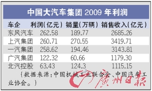 2009年中國成功晉身為全球最大的汽車產(chǎn)銷市場,中國汽車集團(tuán)的賺錢能力也水漲船高,中國三大汽車集團(tuán)東風(fēng)、上汽和一汽集團(tuán)各自的純利潤高達(dá)260億元人民幣(約合38億美元),遠(yuǎn)遠(yuǎn)超過全球聲名顯赫的豐田、大眾、通用,即使與財(cái)政情況較好的本田、福特、現(xiàn)代汽車(25億~27億美元)相比,盈利能力也遙遙領(lǐng)先!叭绻粋(gè)汽車企業(yè)年?duì)I業(yè)額在幾百億元,而利潤只有區(qū)區(qū)幾千萬元,那實(shí)在是沒什么意思!币晃恢袊嚻蟮母邔有判氖愕貙τ浾哌@樣說。