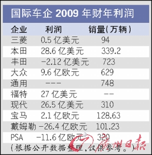 就拿現(xiàn)在全球風(fēng)頭“最勁”的大眾汽車來看,2009財(cái)年的營業(yè)額超過1000億歐元,但利潤只有區(qū)區(qū)9.6億歐元,利潤率還不到1%,如果按其629萬輛的銷量來計(jì)算,每輛車的平均利潤僅有100多歐元,大眾去年全年的盈利恐怕還沒有其在中國的兩個(gè)合資企業(yè)一汽大眾、上海大眾的合計(jì)多。曾經(jīng)是全球第一賺錢車企的豐田汽車受銷量下滑和“召回門”的影響,2009財(cái)年預(yù)計(jì)出現(xiàn)2億多美元的虧損;即使是國人看來利潤豐厚的豪華車制造商戴姆勒-奔馳和寶馬,日子也不是那么滋潤。寶馬集團(tuán)去年在全球售出了近130萬輛汽車,但只有區(qū)區(qū)2.1億歐元的純利潤,而戴姆勒-奔馳更是出現(xiàn)了20多億歐元的虧損。