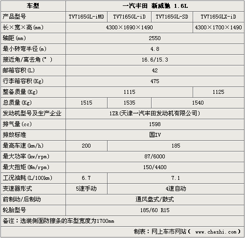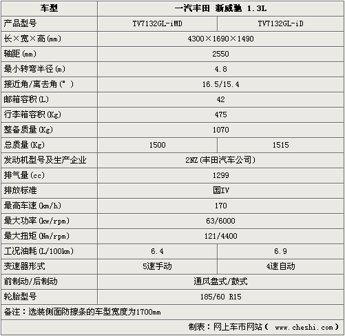 豐田改款新威馳依然由一汽生產(chǎn),同時將有6款車型推出,變速箱份為4速自動和5速手動。排量上分為1.3升與1.6升。長4300mm×寬1690mm×高1490mm的車身尺寸也與老款車型保持一致,完全可以滿足年輕人在日常中的使用,并且新款車型提供了防擦條選裝件,可增加個性與實(shí)用性。