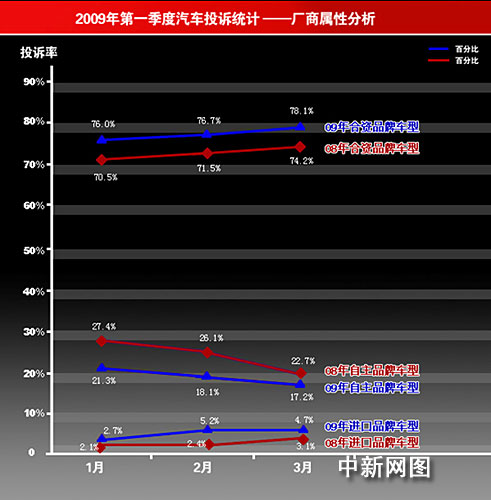 中新網(wǎng)4月24日電 日前,中國質(zhì)量協(xié)會用戶委員會、車人網(wǎng)聯(lián)合發(fā)布了2009年一季度中國汽車產(chǎn)品質(zhì)量與服務(wù)質(zhì)量分析報告。統(tǒng)計顯示,相比去年同期,合資品牌車型的投訴增加較快,進口車投訴略有增加,自主品牌車型的投訴呈現(xiàn)遞減趨勢。