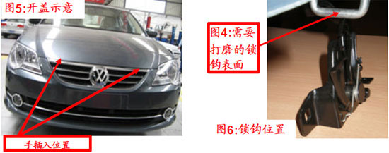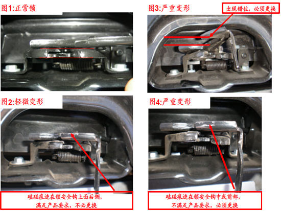 部分新寶來出現(xiàn)發(fā)動(dòng)機(jī)艙蓋開啟困難的現(xiàn)象,用操縱手柄開啟發(fā)動(dòng)機(jī)艙蓋,發(fā)動(dòng)機(jī)艙蓋沒有解鎖彈起(發(fā)動(dòng)機(jī)艙蓋不能正常開啟)。經(jīng)判定為發(fā)動(dòng)機(jī)艙蓋鎖的質(zhì)量問題或裝配質(zhì)量問題,可能為下鎖體變形或者鎖鉤與下鎖體不對(duì)正,進(jìn)而造成關(guān)閉開啟困難或假鎖。
