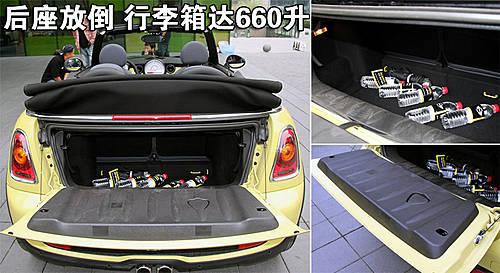 新Mini敞篷擁有較大的行李廂開口,后座椅靠背可單獨(dú)折疊和鎖定,擱板可按需要轉(zhuǎn)動角度,有兩個固定位置可選。行李廂容量在車頂打開時增加到125升,車頂關(guān)閉時達(dá)到170升,后座靠背折放時達(dá)到660升。