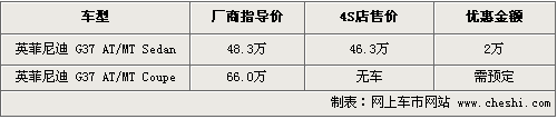 目前銷售的英菲尼迪G37只有四門版車型在售,廠商指導(dǎo)價格為48.3萬元,現(xiàn)在購車可以優(yōu)惠現(xiàn)金2萬元,優(yōu)惠后售價為46.3萬元,店內(nèi)有銀色等款現(xiàn)車供應(yīng),同時兩門版車型尚沒有現(xiàn)車,需要預(yù)訂,訂金為1萬元。