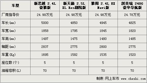 提到中級車市場,人們便會很快的想到新雅閣、新凱美瑞和新天籟這三款日系車型,它們在中級車市場里算是鼎鼎有名的“三位”了。隨著今年7月8日別克繼新君威后的又一力作新一代君越的正式上市,中級車市場迎來了又一款“重量級”車型。新君越的上市更加鞏固了別克在中級車市場的位置,并且給同級別的中級車帶來了更強的競爭力。既然有新車型加入了隊列,那么同級車之間價格和配置的“競爭戰(zhàn)”是必不可少的。下面我們就為您挑選了新君越2.4L豪雅型、新天籟2.5L XL RES劇院版、雅閣2.4L EX導航版和凱美瑞240G 豪華導航版四款價格相近的中級車作為比較,看看這四款熱門車里,哪款車型更適合將要購入中級車的您。