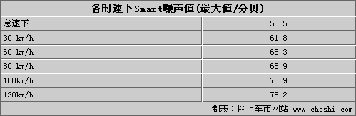 也許有人會(huì)擔(dān)心smart這么小的車隔音和密封性是否有問題,為此我們在北京北四環(huán)路中關(guān)村附近進(jìn)行了測試,在車外我們測得了最高77分貝的環(huán)境噪聲;而當(dāng)我們進(jìn)入到車內(nèi)噪聲指數(shù)立即下降了22分貝之多,55分貝的水平幾乎達(dá)到了辦公室的安靜程度。