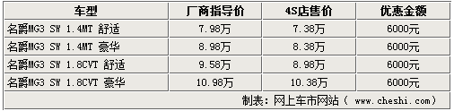 時(shí)值銷售旺季,各廠商紛紛拿出看家本領(lǐng)提高銷量。網(wǎng)上車市網(wǎng)站由經(jīng)銷商處了解到,現(xiàn)在到店購(gòu)買MG3 SW系列車型僅優(yōu)惠6000元,相比前一段時(shí)間的萬(wàn)元優(yōu)惠有大幅度的縮水。具體詳情如下: