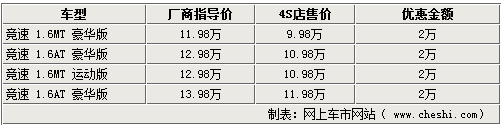 近日,青年汽車旗下車型-蓮花競速傳出很快將完全國產(chǎn)化的消息,在前段時間廠家調(diào)價降10000元后,市場價格再次出現(xiàn)波動。據(jù)網(wǎng)上車市網(wǎng)站了解,青年蓮花競速車型在北京市場也出現(xiàn)了更多的優(yōu)惠政策,現(xiàn)在購車將在廠家調(diào)價的基礎(chǔ)上再優(yōu)惠1萬,最低價格已經(jīng)下探至9.68萬。具體詳情如下: