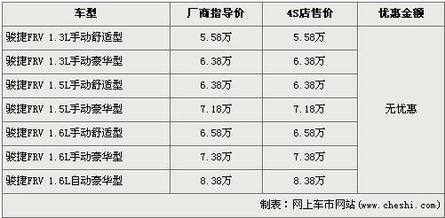 據(jù)經(jīng)銷商處銷售人員介紹,駿捷FRV在售車型已經(jīng)擴大到了7款,新增加了分為舒適版和豪華版的手動1.5L排量車型。目前購買駿捷FRV的消費者在現(xiàn)金方面沒有任何優(yōu)惠,并且全系1.3L和1.6L車型均無現(xiàn)車,1.5L排量車型現(xiàn)車數(shù)量一般,如果錯過此批現(xiàn)車的消費者需交訂金2000元,最早半個月后提車。
