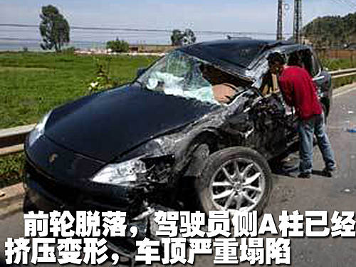 09年5月10日14時左右在高海公路金寶山滇池附近的公路輔路上,發(fā)生了這樣一起令人后怕的恐怖車禍。一臺嶄新的(準(zhǔn)確的說,是還沒有上牌的)保時捷卡宴,與一臺拉著水泥運輸大罐車“迎面相撞。