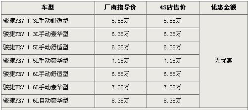 駿捷FRV是中華汽車首款兩廂車型,排量分為1.6L和1.3L,兩種排量車型分別在去年5月份和7月份上市。近期,駿捷FRV的車型再次得到了豐富,1.5L車型已經(jīng)進(jìn)入各家中華經(jīng)銷店并開始售賣,駿捷FRV全系的售價(jià)區(qū)間為5.58萬元-8.38萬元。根據(jù)我們價(jià)格系統(tǒng)監(jiān)測(cè)顯示,駿捷FRV全系取消了現(xiàn)金優(yōu)惠,具體詳情請(qǐng)看下表: