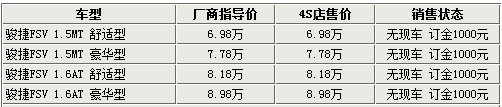 經(jīng)銷(xiāo)商透露,現(xiàn)在各店內(nèi)的FSV基本為展車(chē)或已被客戶預(yù)訂的車(chē)輛,基本沒(méi)有現(xiàn)車(chē)可以滿足消費(fèi)者的需要,消費(fèi)者如需購(gòu)買(mǎi)可以繳納1千元訂金后等待一個(gè)月左右即可提車(chē)。由于駿捷FSV為剛剛上市的新車(chē),所以店內(nèi)沒(méi)有任何形式的優(yōu)惠,請(qǐng)消費(fèi)者諒解。