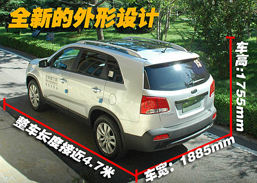 全新索蘭托一改老款車型略顯呆板的外觀造型,全車頭部線條銳利。整車線條非常流暢,車身尺寸為:長(zhǎng)4685mm,寬1885 mm,高1755 mm,長(zhǎng)度比老款車型增加了95 mm。前部保險(xiǎn)杠以及車門多處的鍍鉻裝飾顯得非常有檔次。