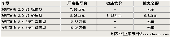 據(jù)比亞迪4S店銷(xiāo)售人員介紹,目前比亞迪F6只有2.0L手動(dòng)舒適型有現(xiàn)車(chē)銷(xiāo)售,可以?xún)?yōu)惠8000元現(xiàn)金,如果到店詳談還可以有更多的優(yōu)惠政策。而2.0L手動(dòng)標(biāo)準(zhǔn)型因?yàn)榕渲幂^低,北京市場(chǎng)一直就沒(méi)有現(xiàn)車(chē);2.4L車(chē)型也需要預(yù)定,交付訂金后需等半個(gè)月左右即可提車(chē)。