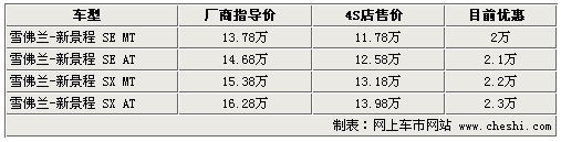 據(jù)4S店銷售人眼介紹:目前新景程現(xiàn)車非常充足,顏色也較為齊全,。目前優(yōu)惠幅度最高可達(dá)2.3萬(wàn)元,最少也在2萬(wàn)元。最低配置車型已經(jīng)下降至11.78萬(wàn)元。