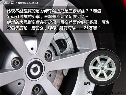 你注意到了嗎?smart的輪轂僅僅用三顆螺絲就固定在了軸承上,而一般我們見到的車至少需要4顆螺絲,看來這種車在國外真的是最低端的類型,但引進(jìn)到國內(nèi),它的價(jià)格可不便宜,如果不是極端追求個(gè)性后者對smart情有獨(dú)鐘,還真不太好接受。